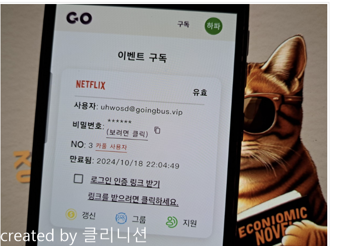 결제 완료되었으면 우측 상단에 '구독' 메뉴에서 가입된 서비스를 확인할 수 있어요. 여기서 내가 사용할 NETFLIX의 사용자 아이디와 비밀번호를 확인하여 로그인하시면 되겠습니다.