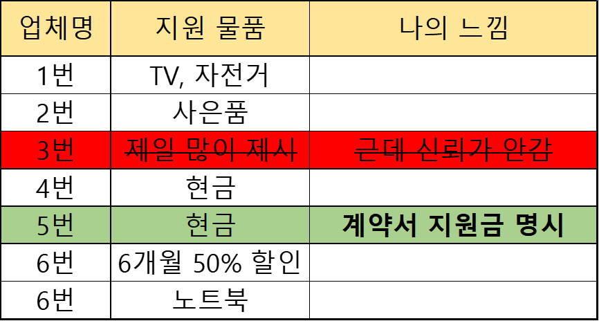 일부 업체는 TV, 노트북, 자전거 등을 제공하기도 하지만, 저는 현금 지원을 선택하였습니다. 반드시 확인하셔야 할 사항은